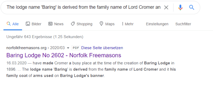 Nach bekannten Informationen war kein Baring Freimaurer. Es gibt jedoch eine Freimaurerloge in Cromer, einer kleinen Küstenstadt in England, die den Namen Baring Lodge trägt. Die Loge wurde 1896 gegründet. Zu diesem Zeitpunkt war Evelyn Baring bereits vier Jahre Baron der Ortschaft Cromer. Drei Jahre nach der Logengründung wurde er zum Vizegrafen von Cromer und nach weiteren zwei Jahren zum Grafen von Cromer ernannt. Auch auf der Homepage der Loge stand, dass sich ihr Name von der Baring Familie ableitet. Auf dem Banner der Baring Lodge ist das Familienwappen des Grafen von Cromer. Inzwischen kann man leider nicht mehr ohne Passwort auf die Logeninfos zugreifen und die PDF wurde anscheinend gelöscht. Da Google aber paar Tage braucht, bis der Text einer Website nicht mehr über die Google-Suche auffindbar ist, konnte ich einen Screenshot machen: